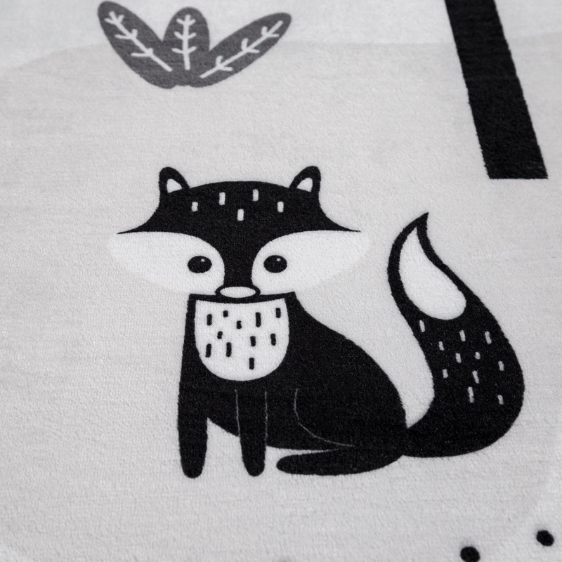 A világos alapszínű, stílusos fehér szőnyeg jól illik modern vagy természetes hangulatú berendezésekhez, miközben nem túl harsány, így könnyedén a szoba harmonikus részévé válik. Az erdei állatok és a gyerekszőnyeg együtt olyan mesés világot teremtenek, amely a gyerekek kedvenc helyszíne lesz.