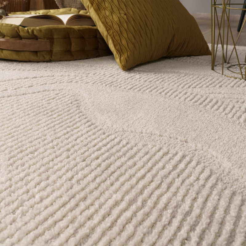 Ez a modern 3D krém szőnyeg ideális választás, ha szeretnél letisztult, skandináv hangulatot és vizuális élményt vinni a nappalidba, miközben praktikus és tartós megoldást keresel.