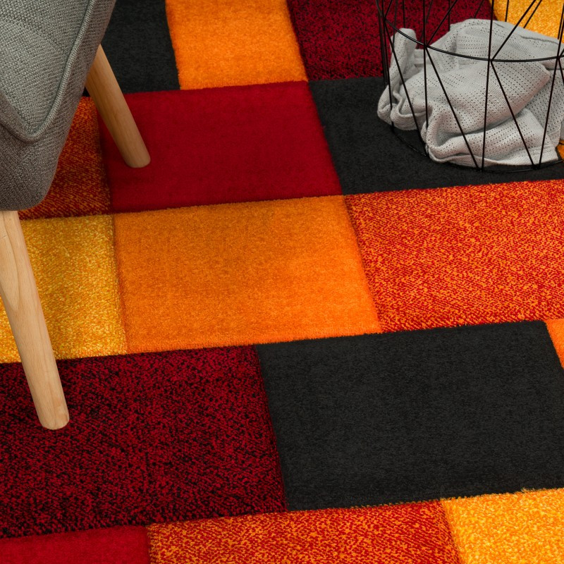 Modern szőnyeg nappaliba - geometria, négyzet mintás, piros-narancs, 80x300 cm