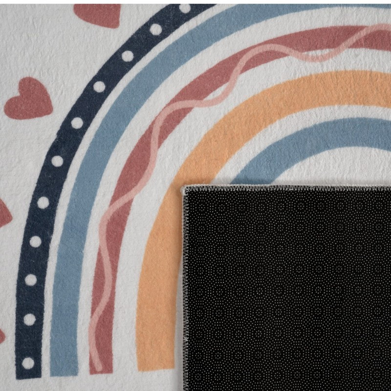 Ez a vidám, színes gyerekszőnyeg szivárvány mintával igazán különleges hangulatot teremt a gyerekszobában. A ragyogó szivárvány minta élénk színei pozitív energiával töltik meg a teret, miközben játékos, mégis barátságos atmoszférát alakítanak ki tökéletes választás egy kreatív és boldog környezethez.